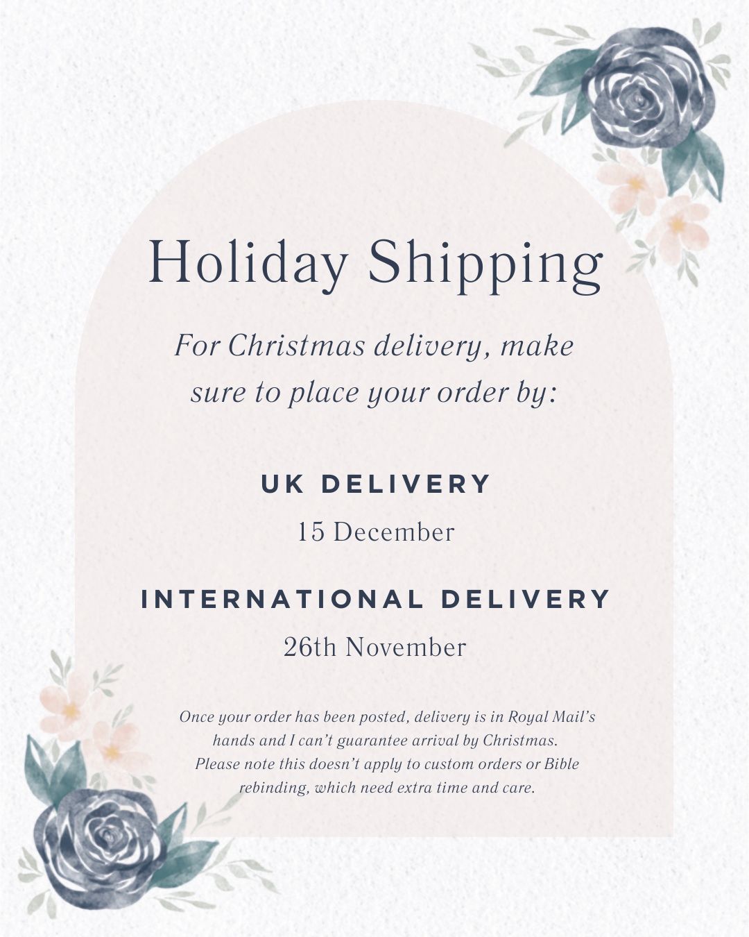 Once parcels are posted, delivery is in Royal Mail’s hands, and while I follow their recommended posting dates, I cannot guarantee arrival by Christmas. These timings apply to standard orders only — custom requests and Bible rebinding services require extra care and cannot be included within these deadlines.