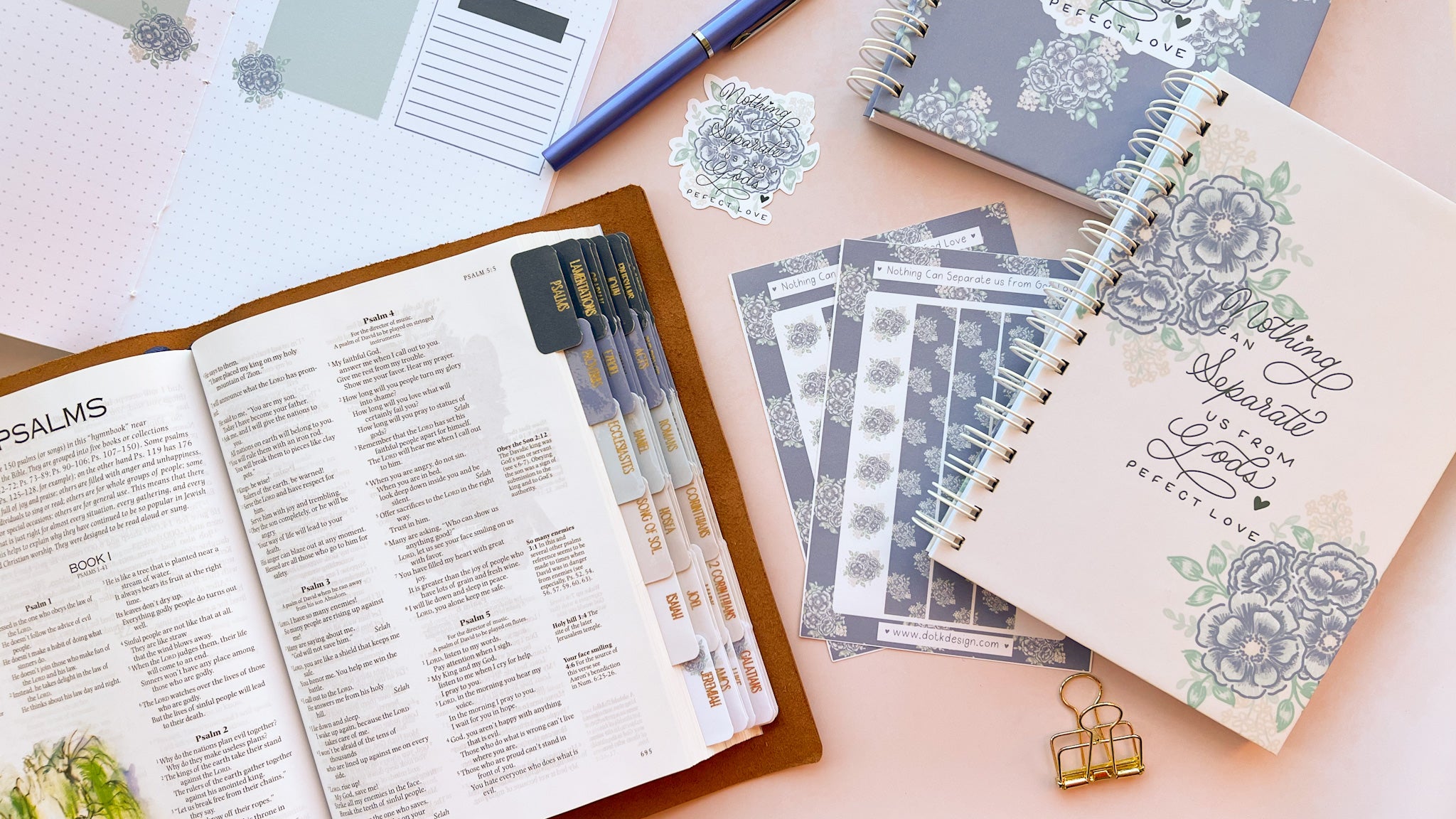 From soft-hued Bible tabs to thoughtfully designed journals, each piece is created with prayerful care—designed to bless your quiet time and support your devotional rhythm.