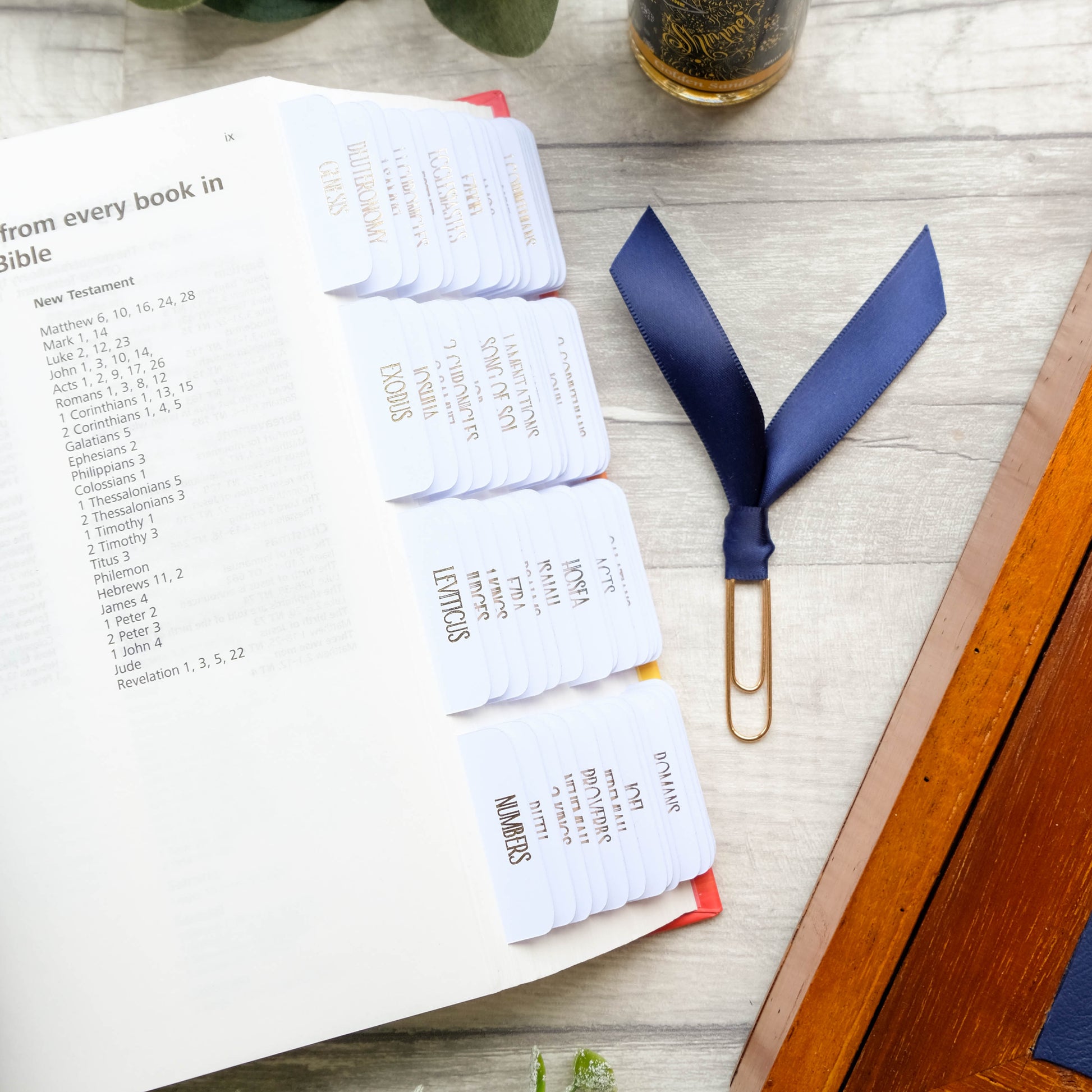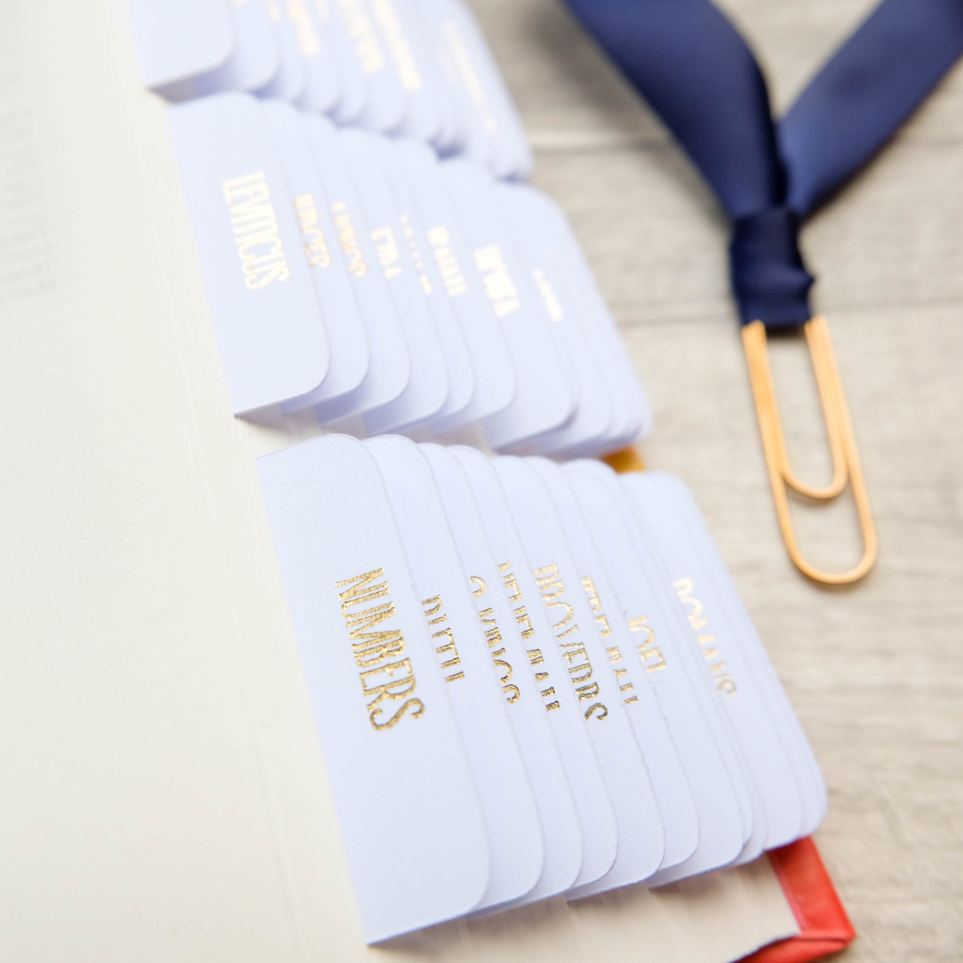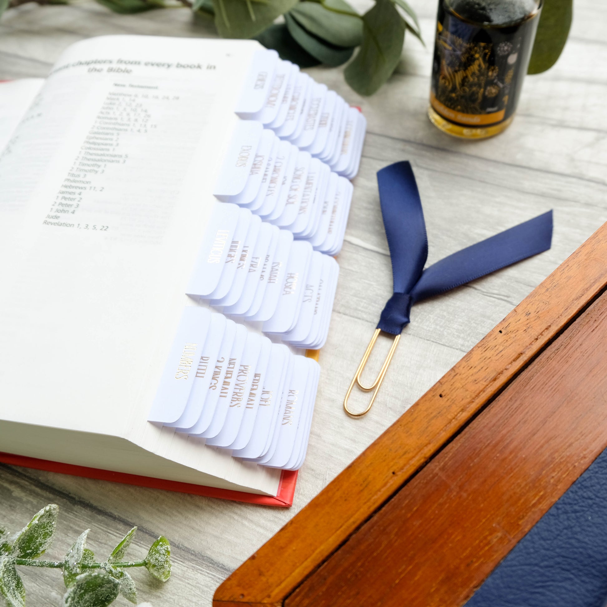 Handcrafted in the UK, these Elegant White Gold Foil Bible tabs feature Gold Foil Bible book names - designed to bring clarity and beauty to your time in the Word.