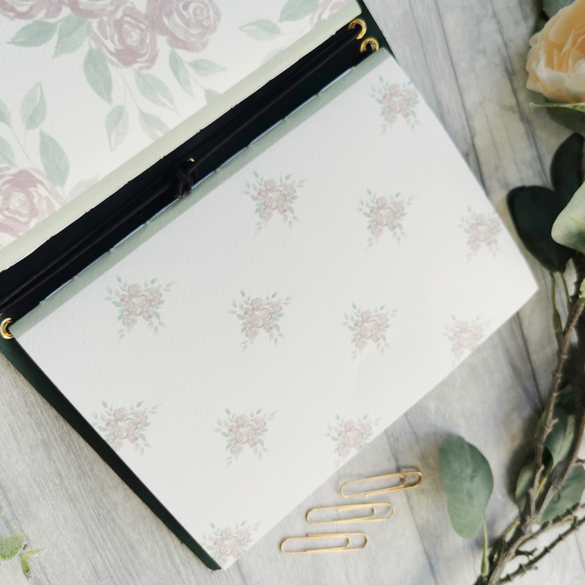 Hand bound and printed from original watercolour paintings from me here at DotK, in shades of blush pink and lush greens.