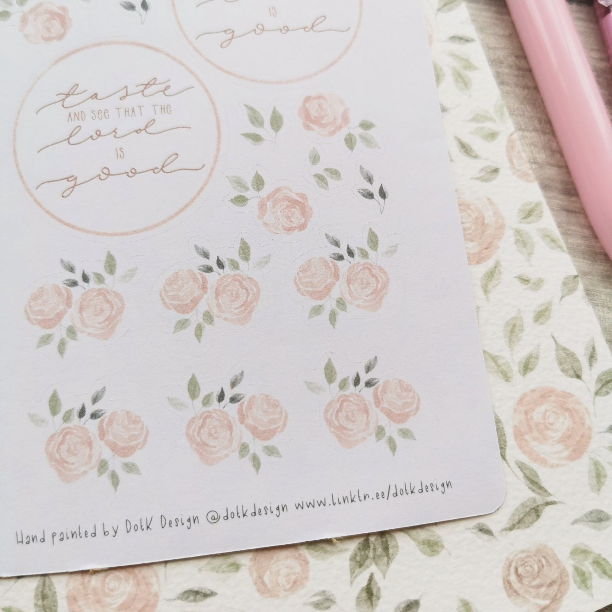Blush pink roses and sage green foliage take centre stage for this sticker sheet, along with the beautiful scripture from Psalm 34:8.