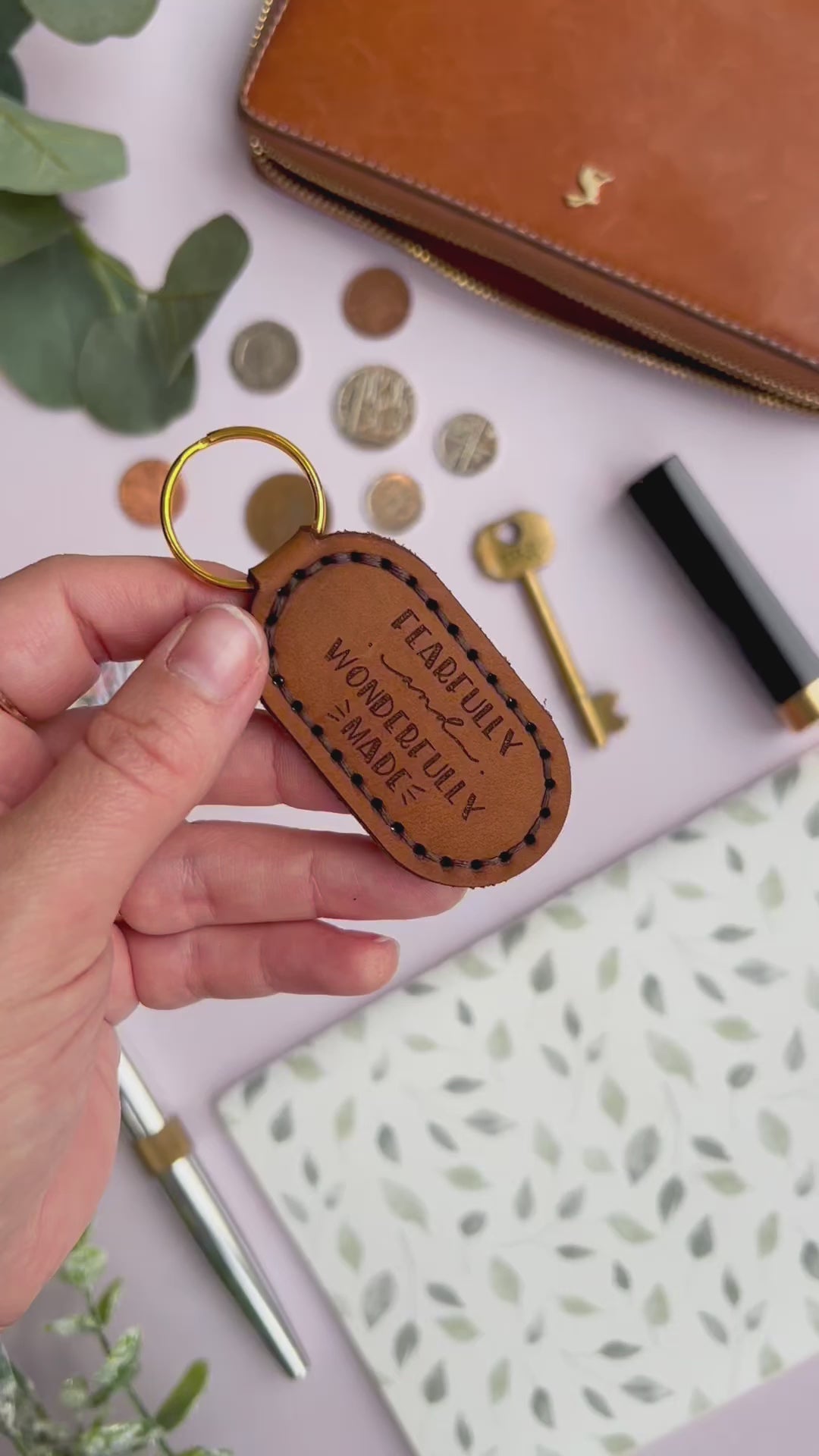 Each Key fob measures approx 6.5cm x 3.5cm - Inspired by Psalm 139:14 featuring “Fearfully and Wonderfully made” - engraved into the stunning tan coloured Leather.