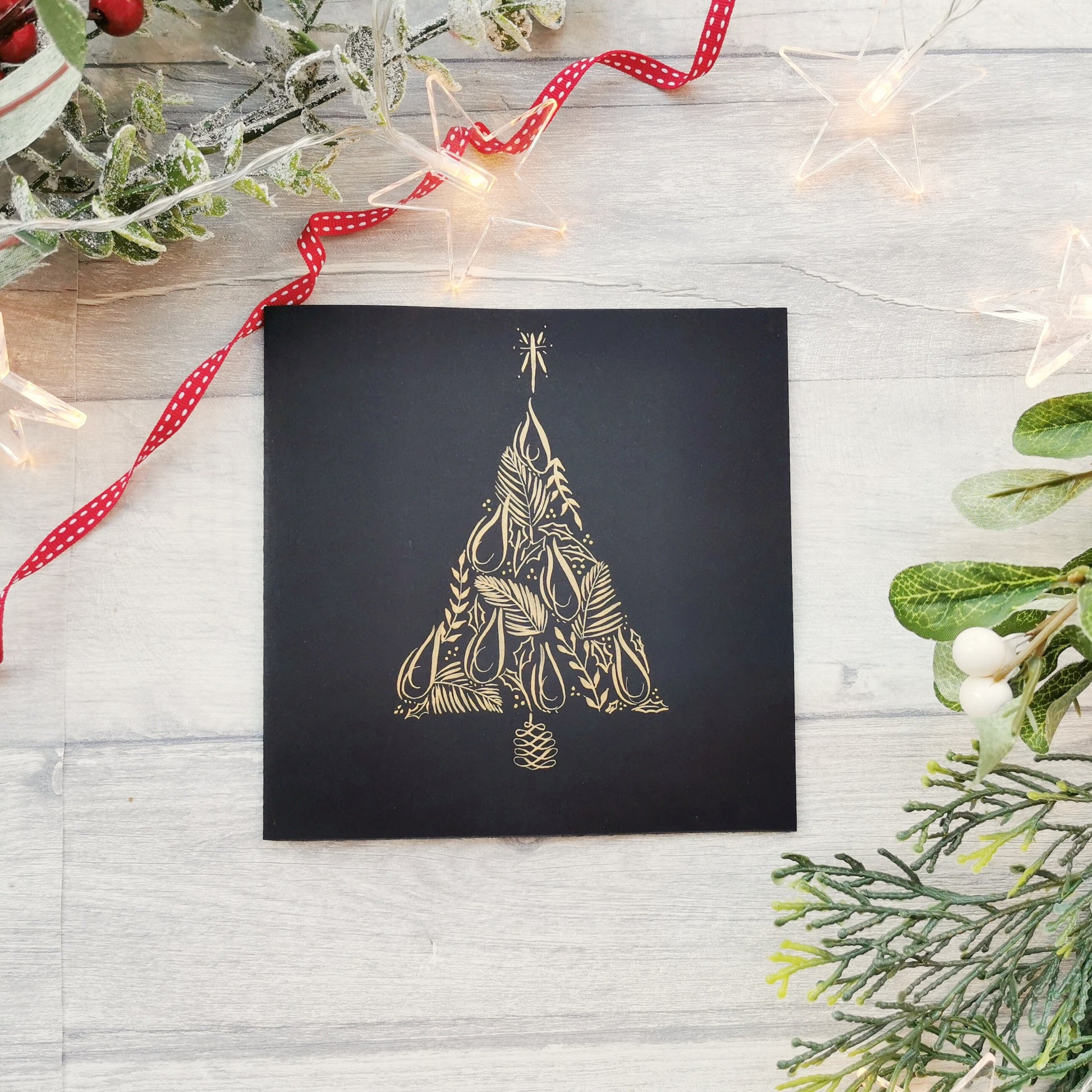 Each 6 inch square black Christmas card is hand drawn, with a traditional dip pen, using a stunning shimmery Gold ink.