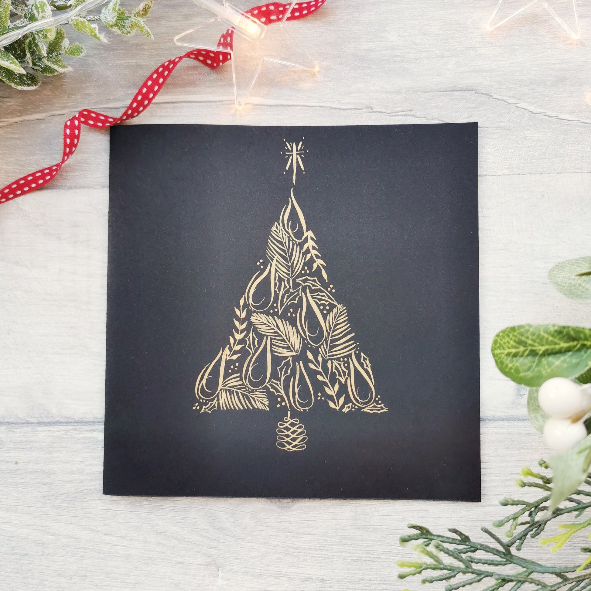Gold Christmas Tree Card - Hand Drawn Calligraphy Flourishes