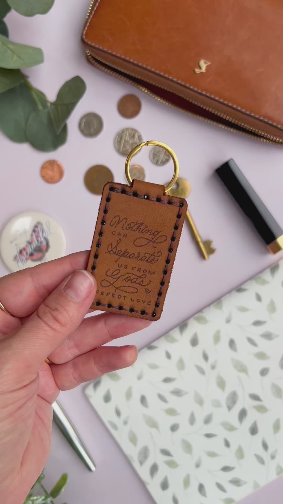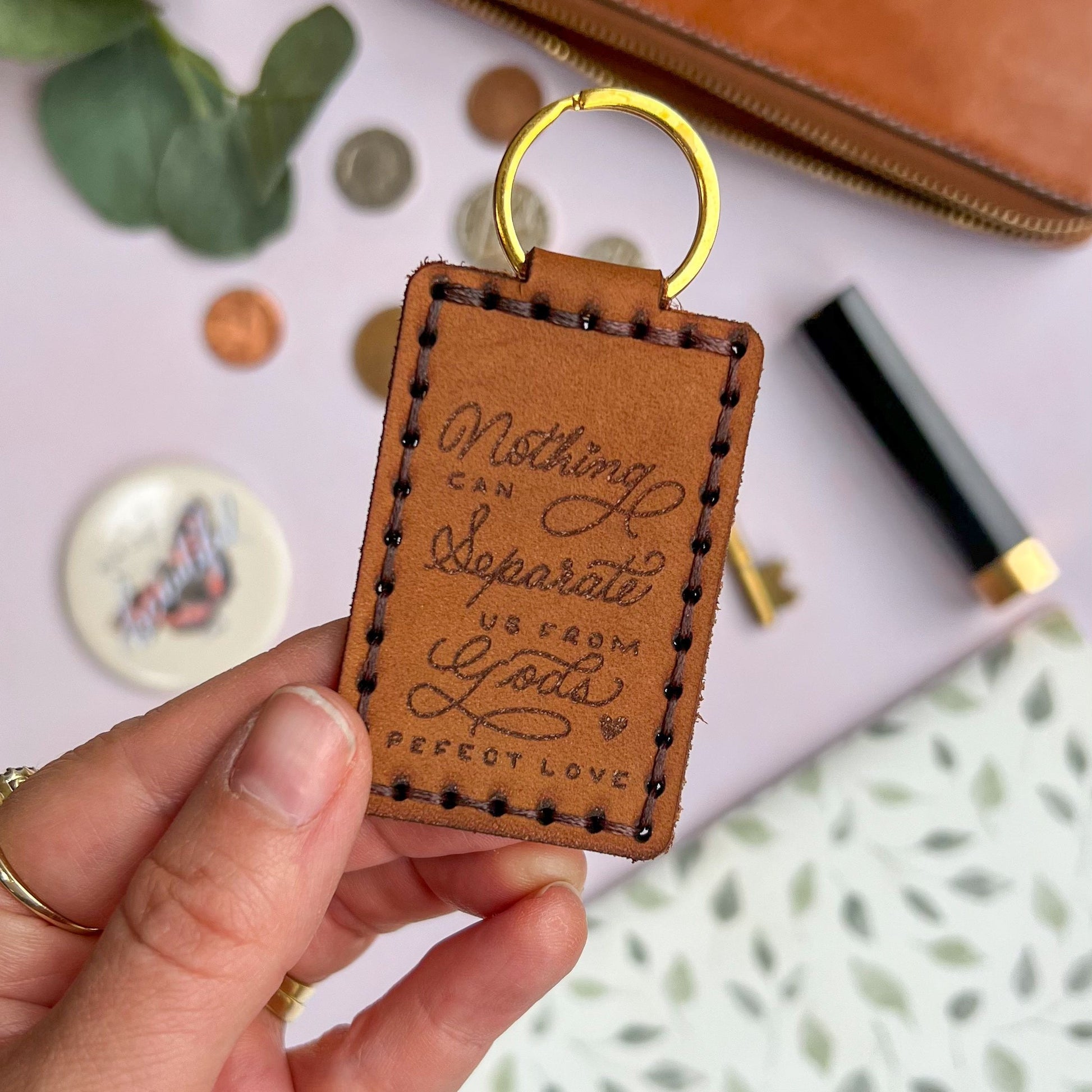 Each Key fob measures approx 6cm x 4cm - Inspired by Romans 8:38-39 featuring “Nothing can seperate us from God’s perfect Love” - engraved into the stunning tan coloured Leather.