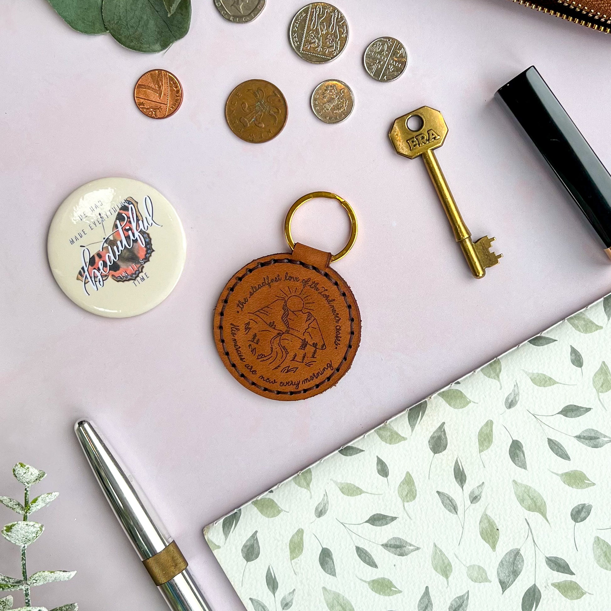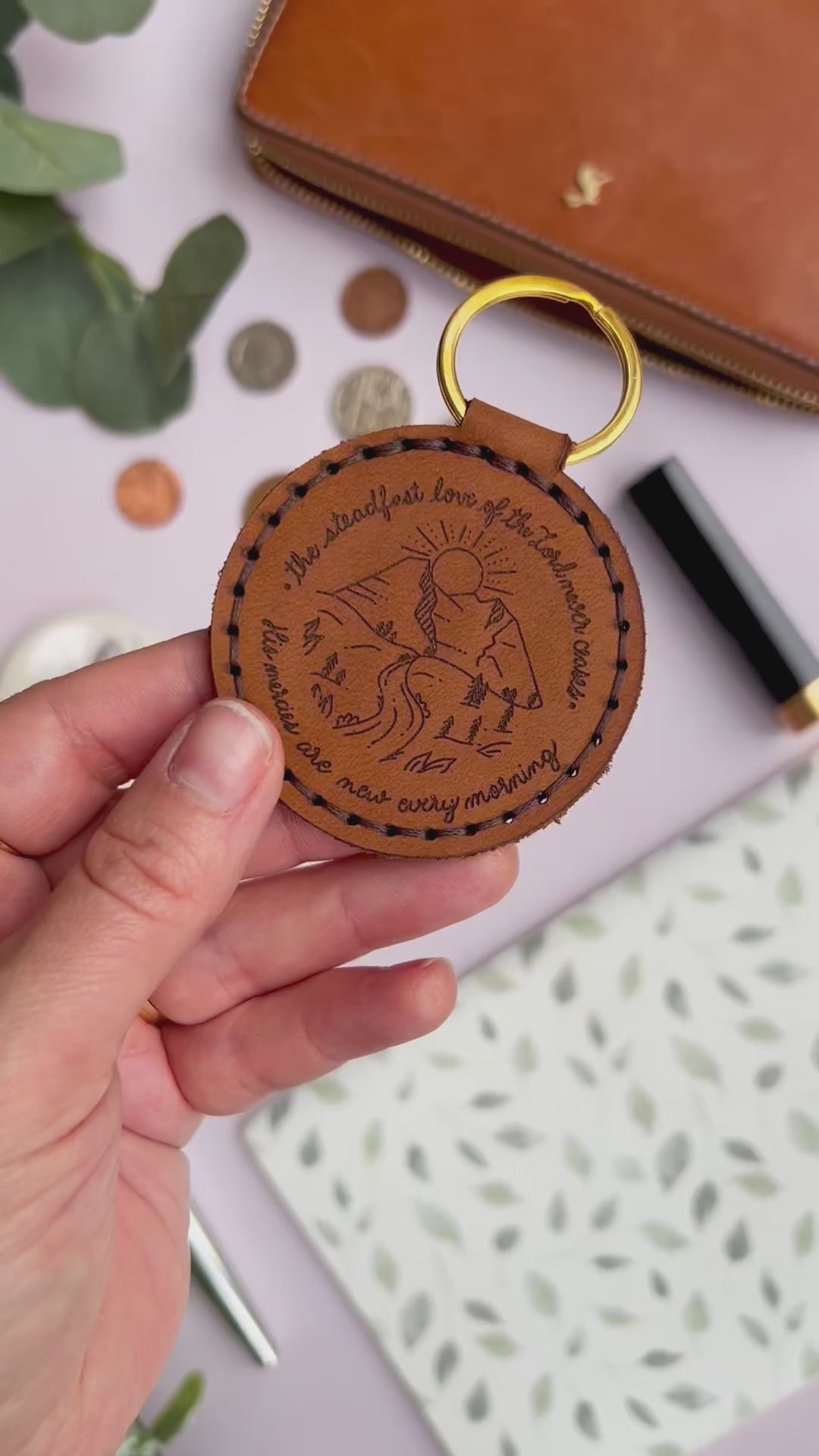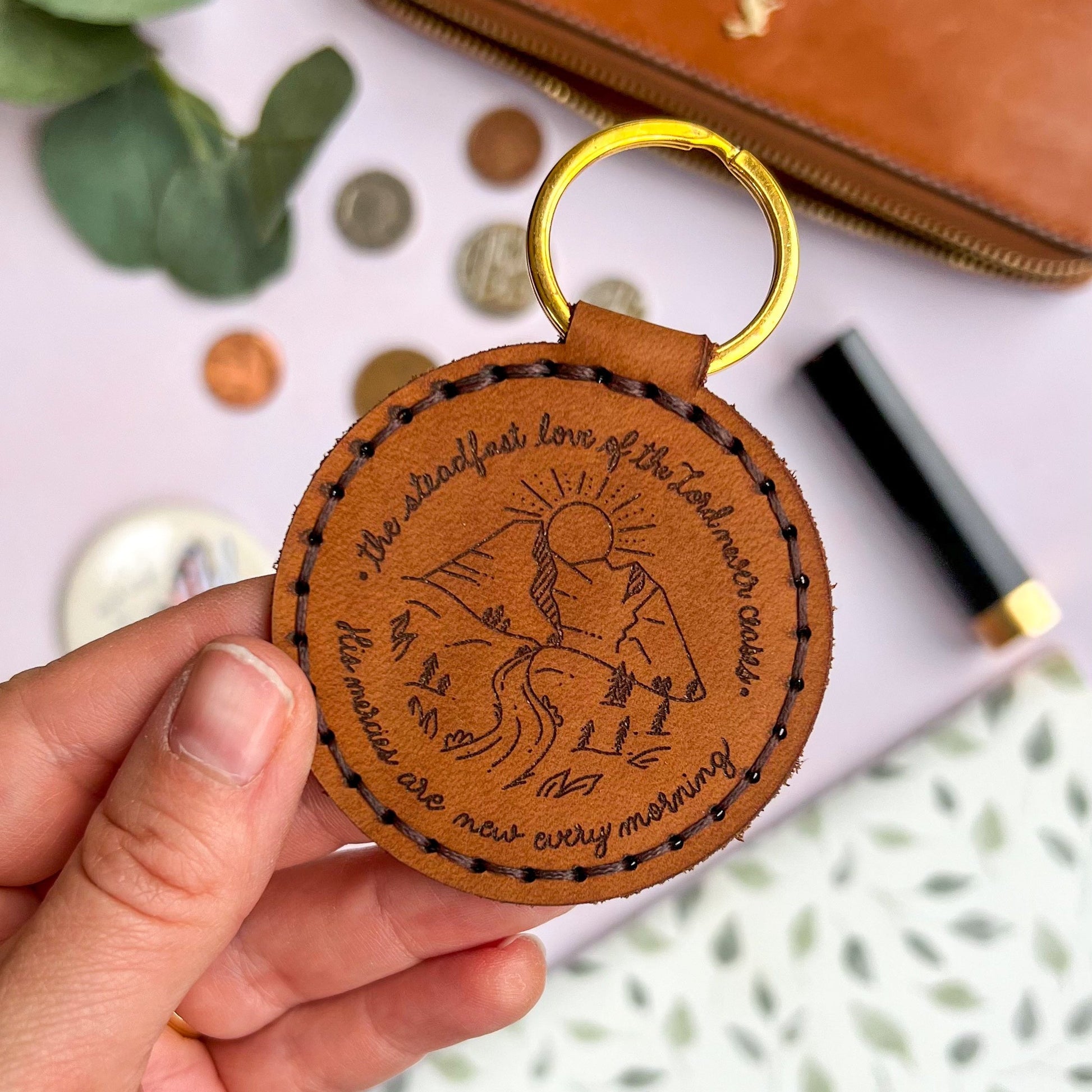 Each Key fob measures approx 6cm in diameter - featuring a mountain range design with scripture ”The steadfast Love of the Lord never ceases - His mercies are new every morning’ - engraved into the stunning tan coloured Leather.