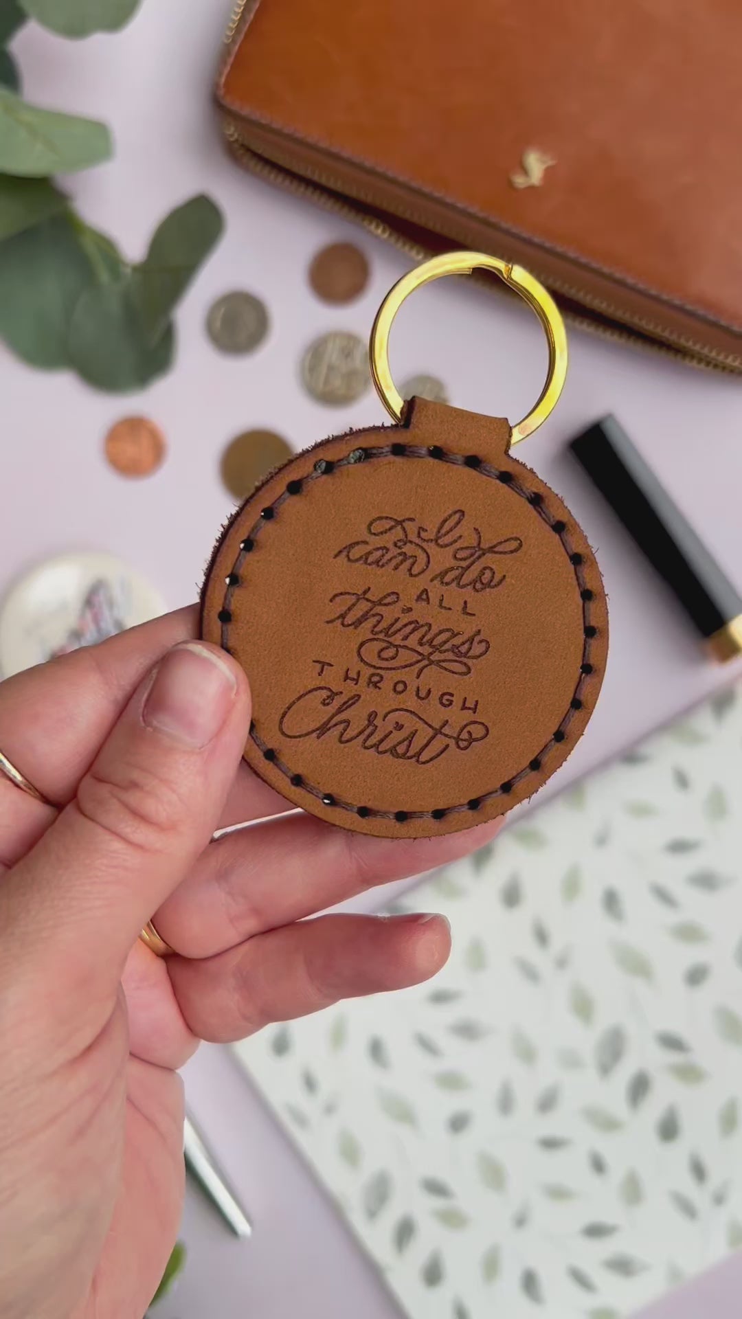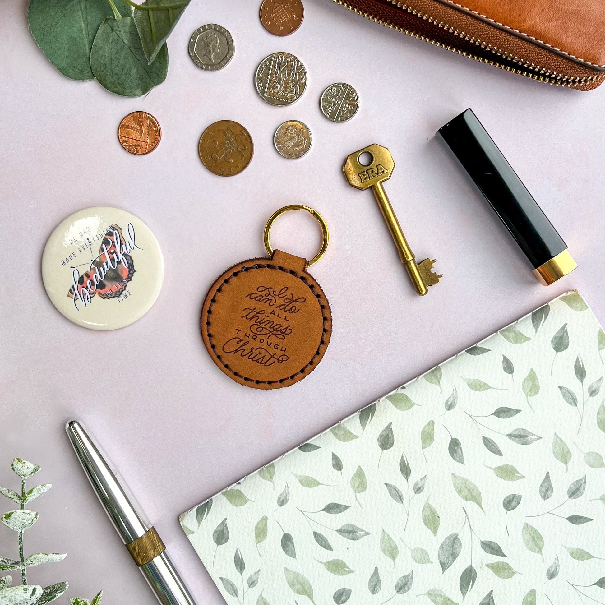Each Key fob measures approx 6cm in diameter - featuring an excerpt from Philippians 4:13 “I can do all things through Christ” - engraved into the stunning tan coloured Leather.