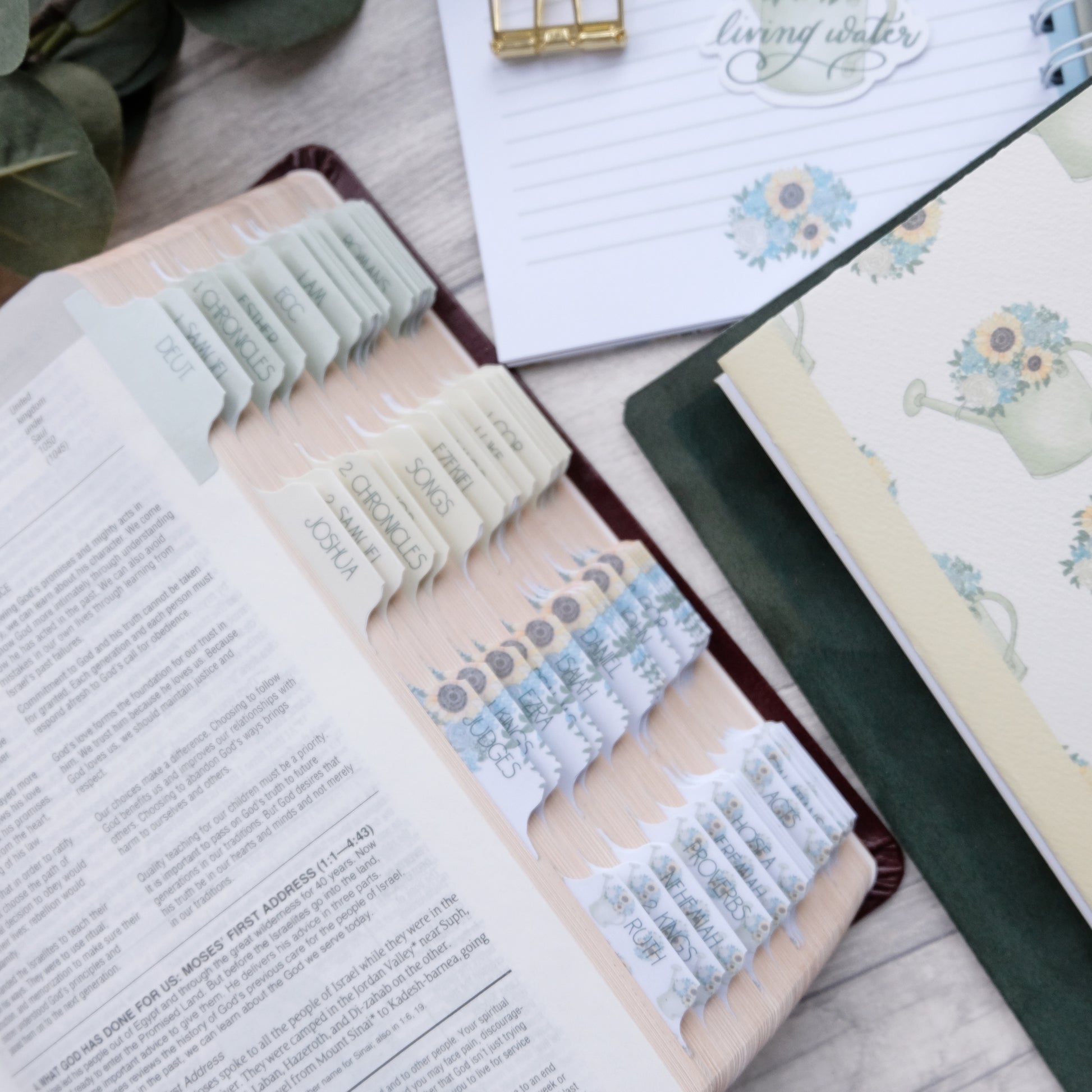 Handcrafted in the UK, these Living Water Bible tabs feature Shades of Green & Yellow, and a Beautiful Watering Can floral design with hand-lettered Bible book names - designed to bring clarity and beauty to your time in the Word.
