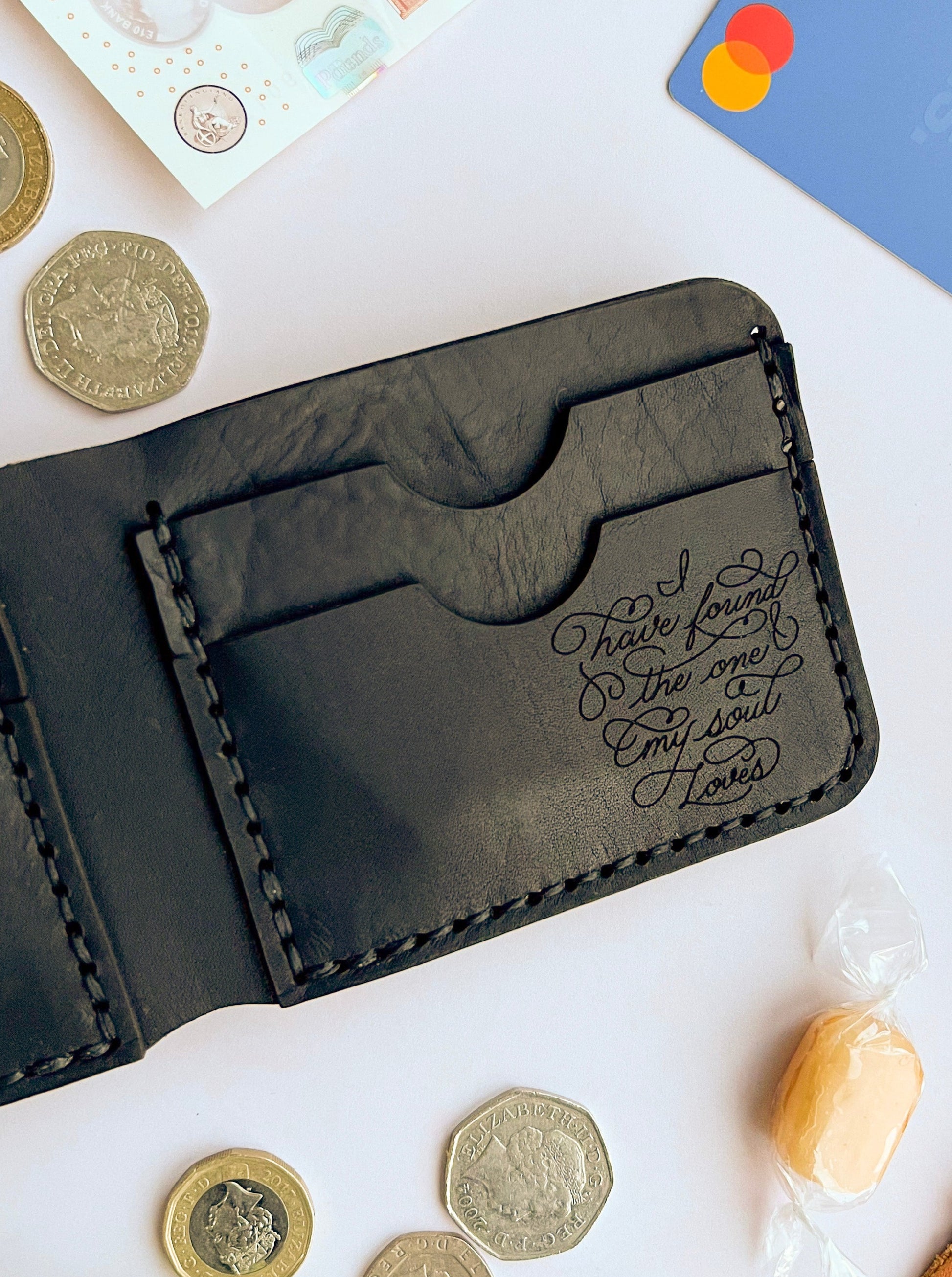 A beautifully handcrafted leather bi-fold wallet - perfect for that special someone - engraved with an except from Song of Solomon and can even be personalised for the extra special touch.
