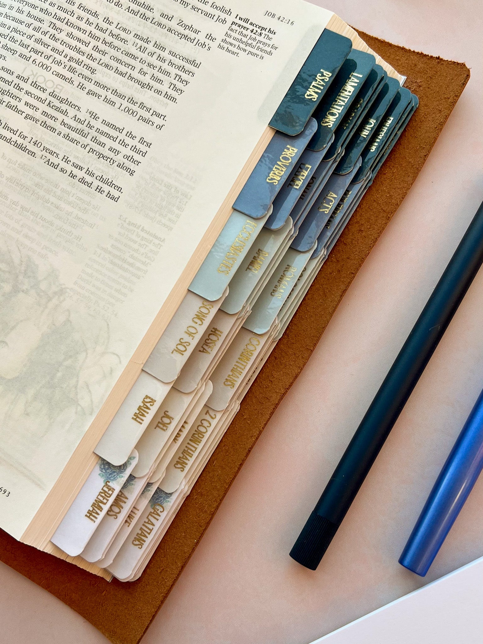 Before being rebound each bible has its spine strengthened and restored to ensure it will last for many years to come. 3 new navy blue ribbon markers have also been added along with the "Nothing Can Separate Us" Bible Tab set