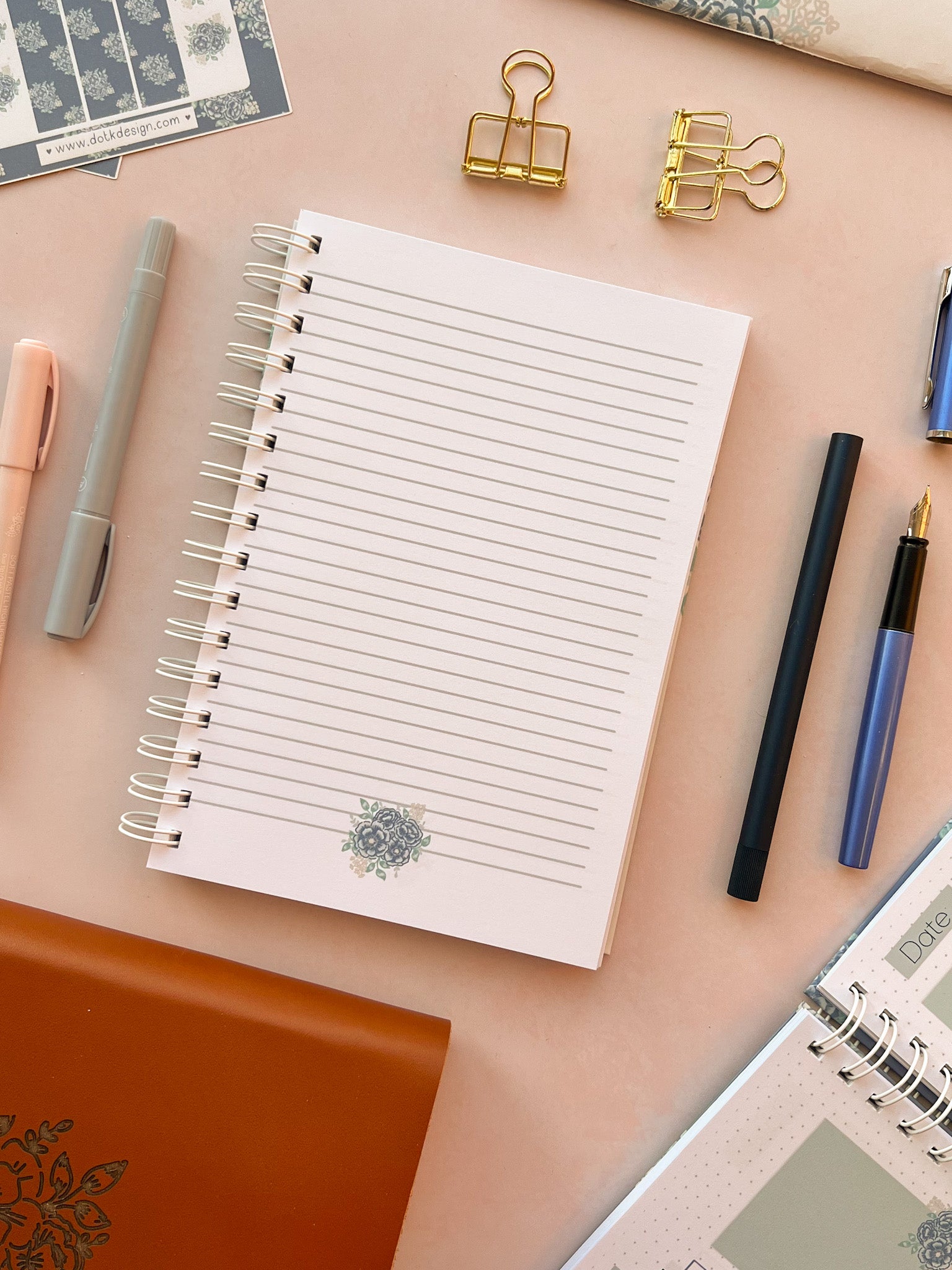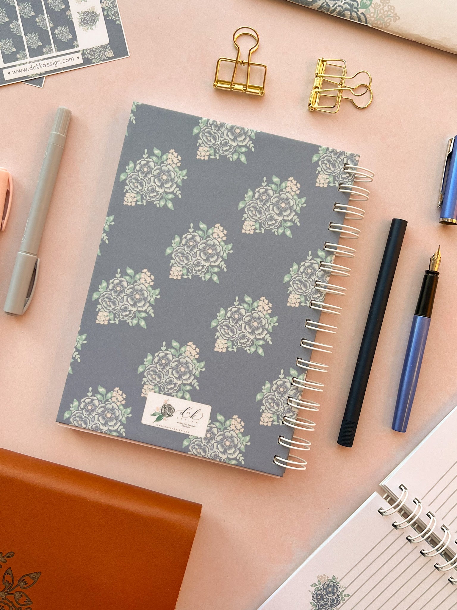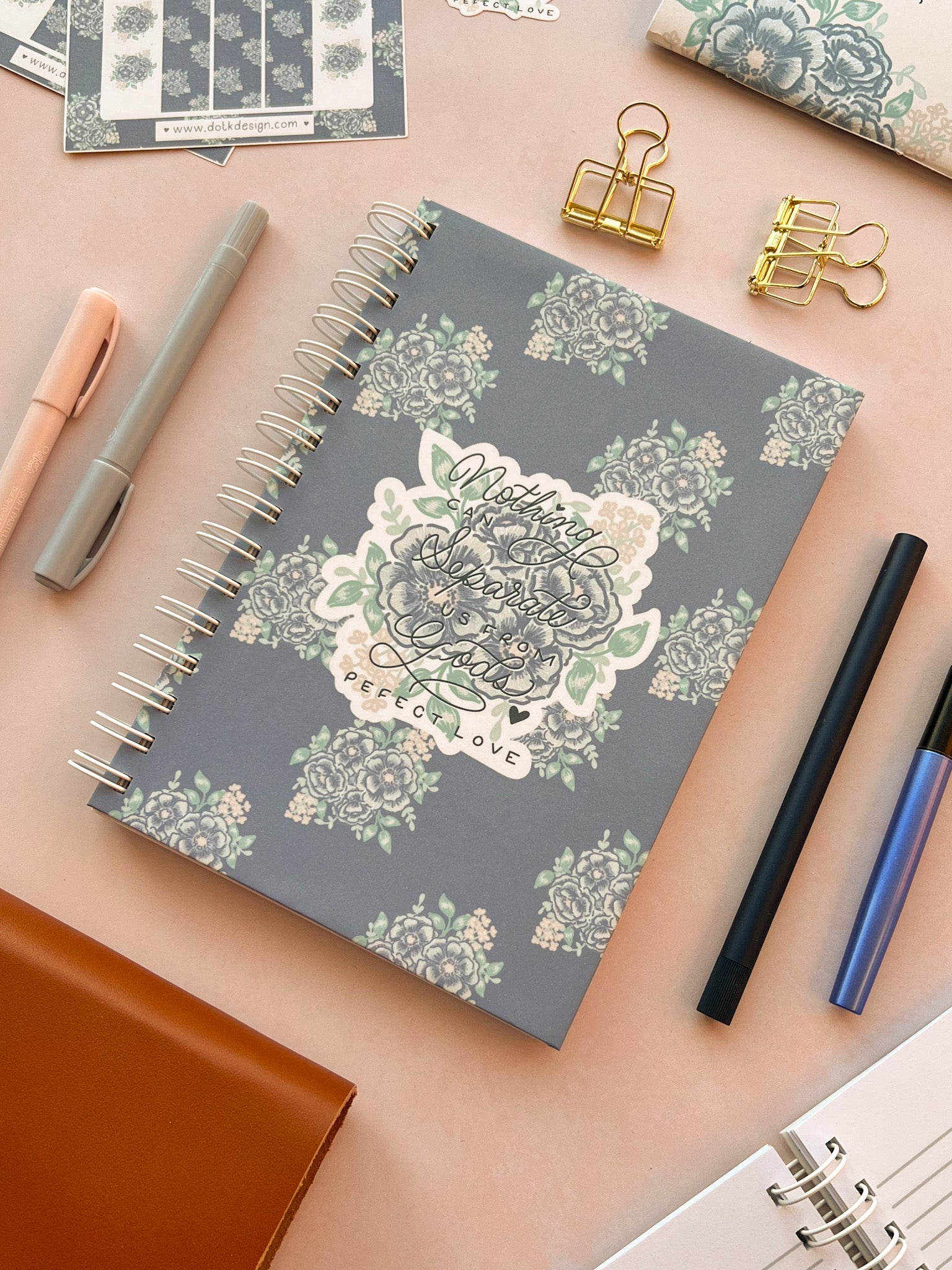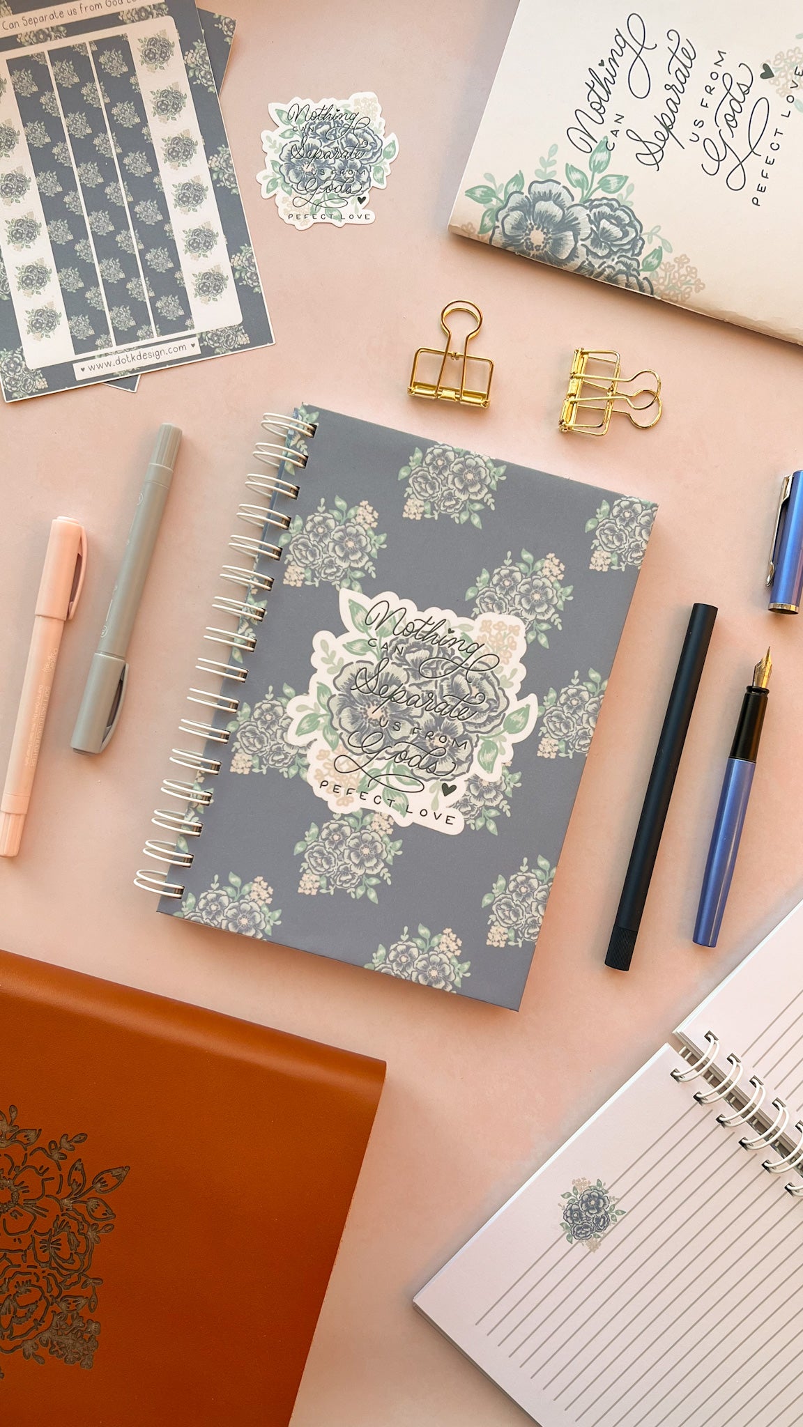 Each Matt Laminated cover is printed with beautiful florals and a hand lettered design based on Romans 8:38-39, which is then wire bound with the 160 A5 pages (80 sheets).