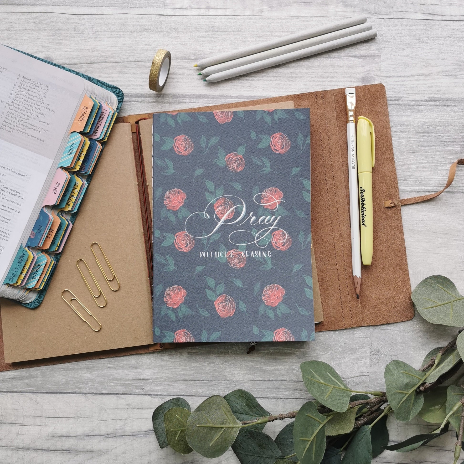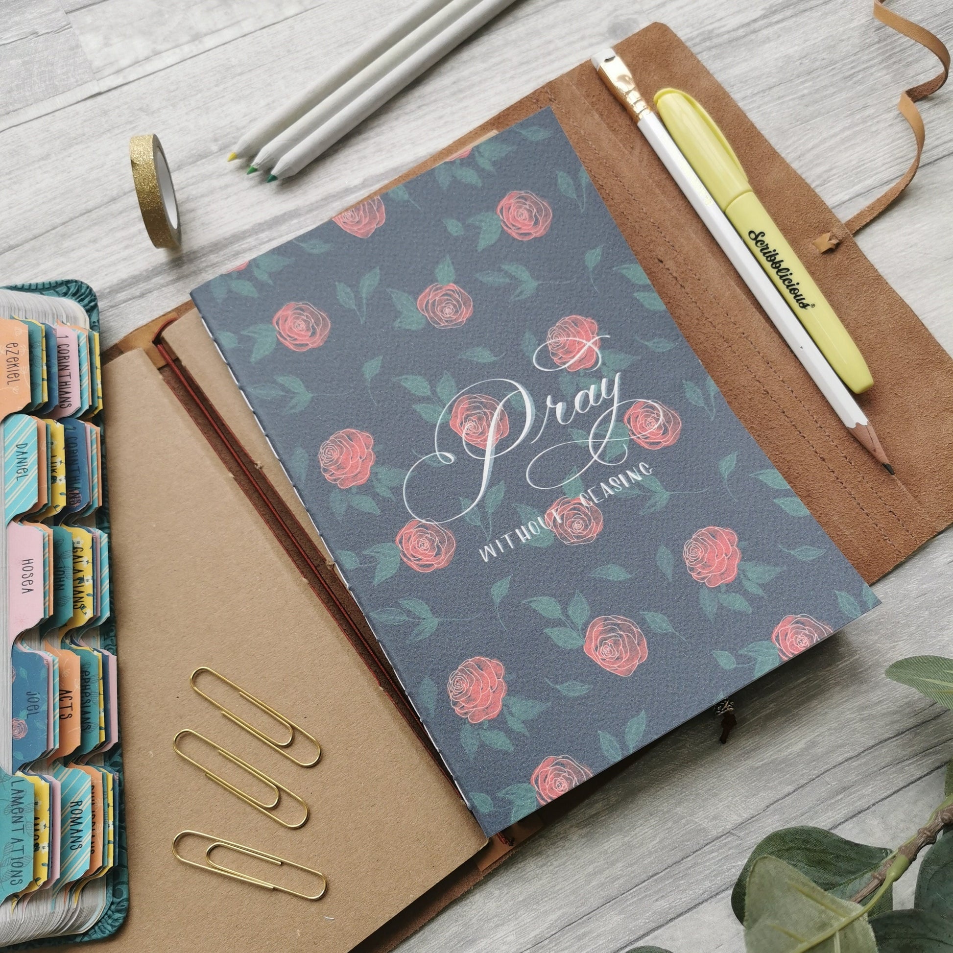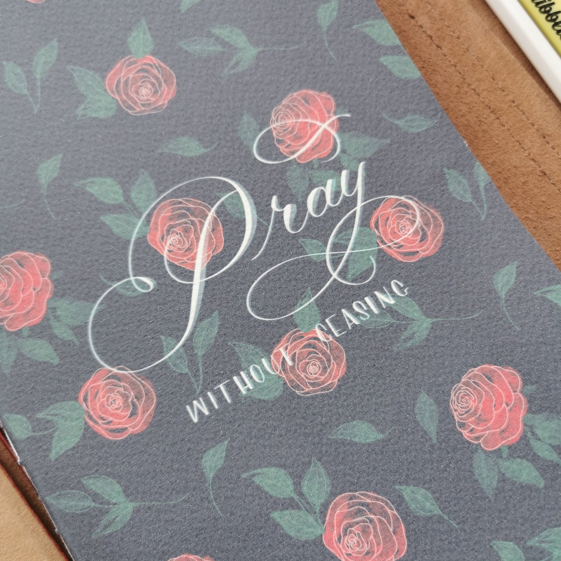 Navy blue and covered in pinky red Roses and foliage, this lovely prayer journal note book is perfect for your study, prayer and reflection time in God’s Word and features 1 Thessalonians 5:17 lettered in a copperplate style with graceful flourishes.