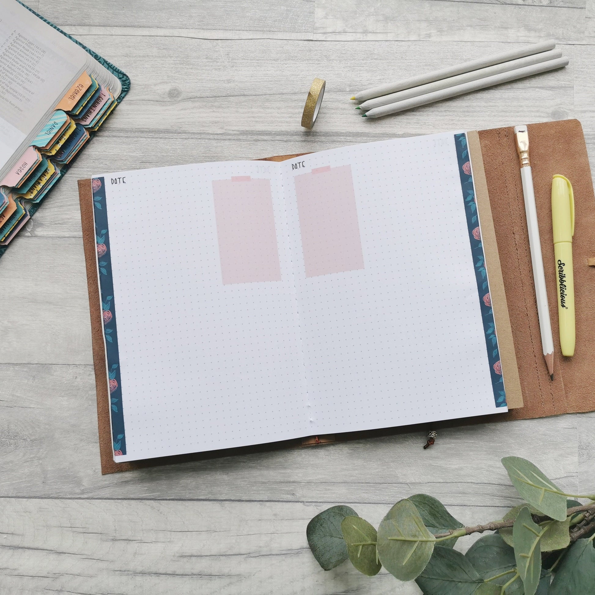 The cover of each A5 journal is printed on 200gsm watercolour paper, which is then hand stitched together with the 40 dot grid pages (20 sheets) which each feature the matching roses design in a tape style on the edge of each page, with a space for the date & a pink box for noting anything of important, maybe answered prayer or scripture verses.