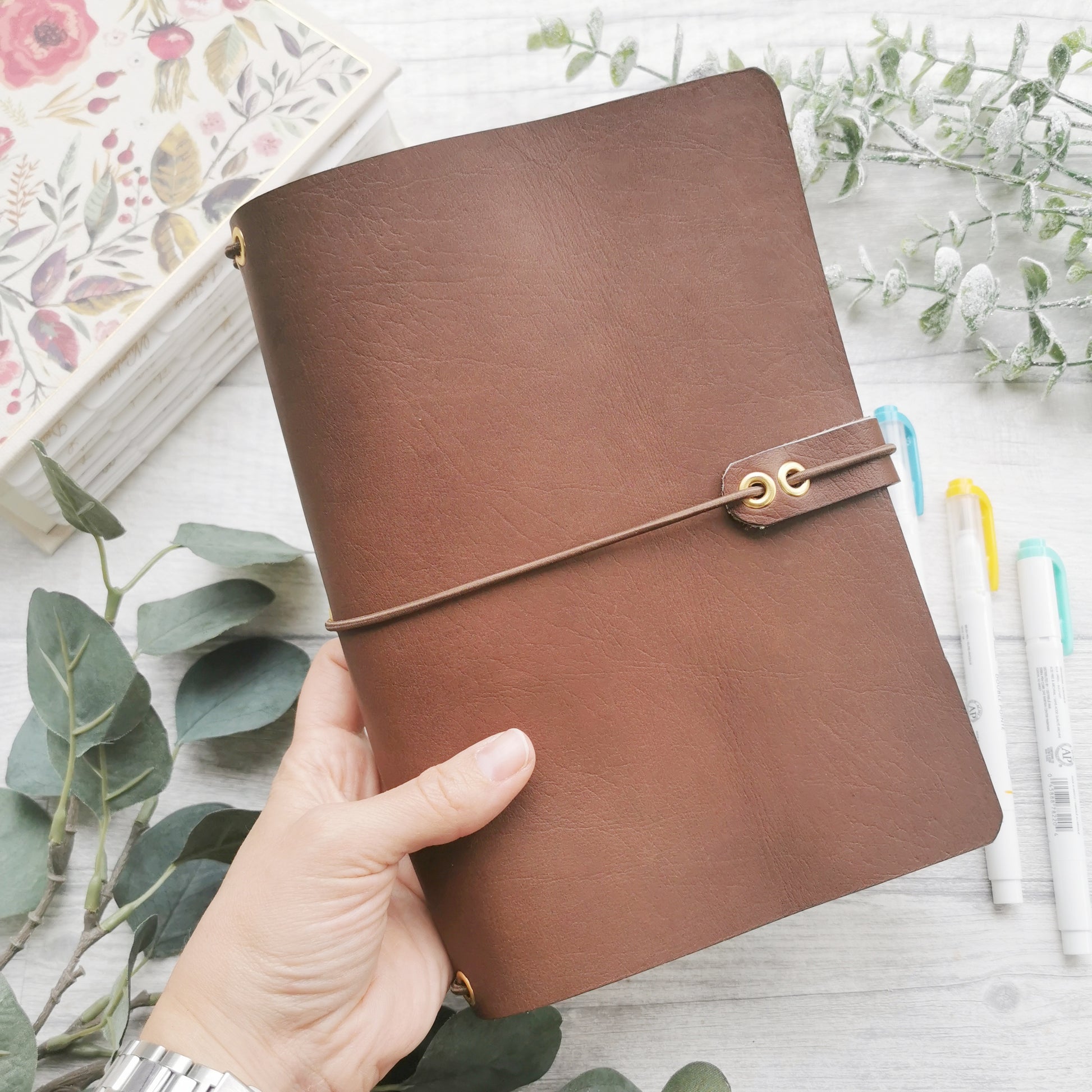 Perfect for keeping up to 4 A5 or smaller journals, each secured with an brown elastic fastening. Finished with brass coloured eyelets, to ensure longevity, and an elastic closure with leather edge protector.