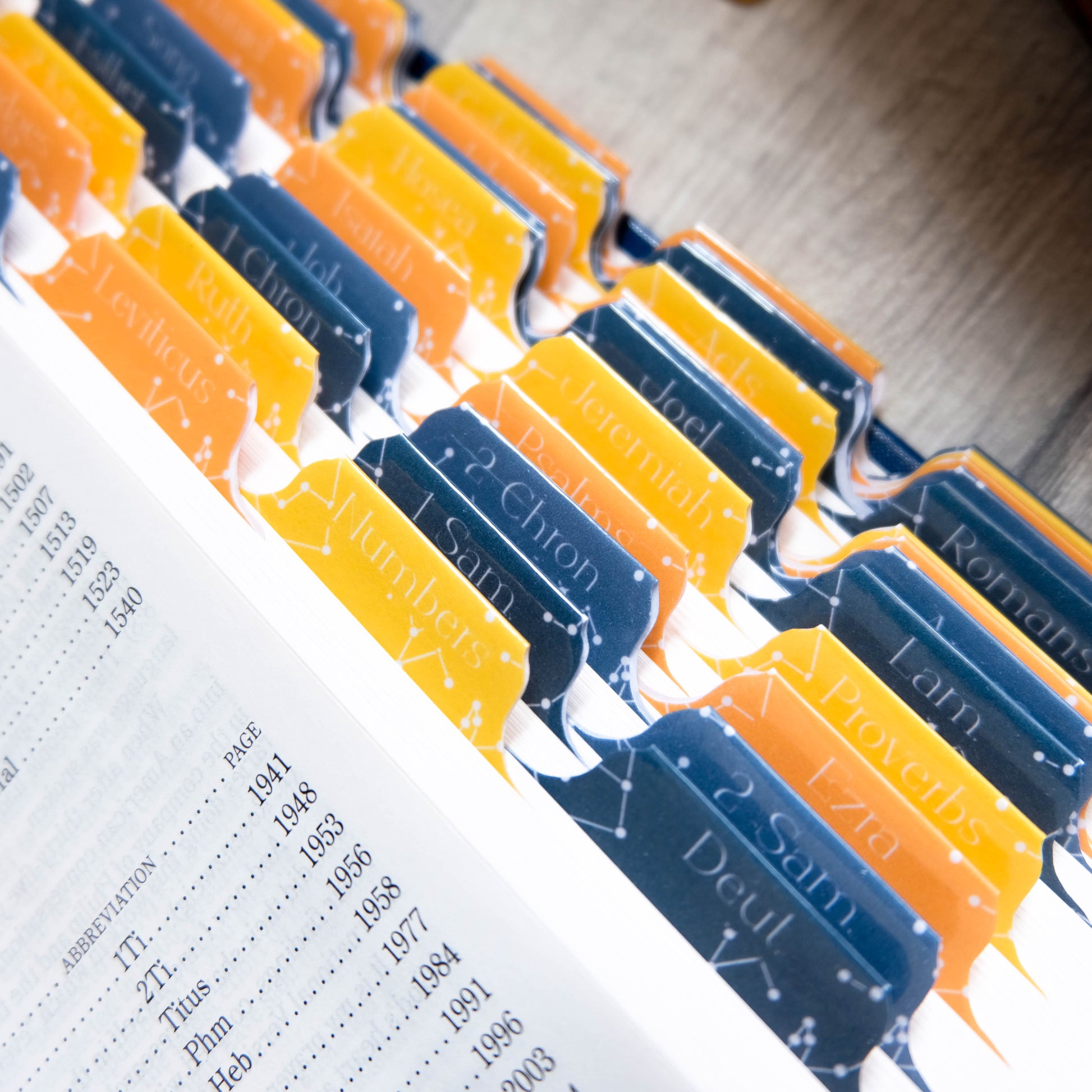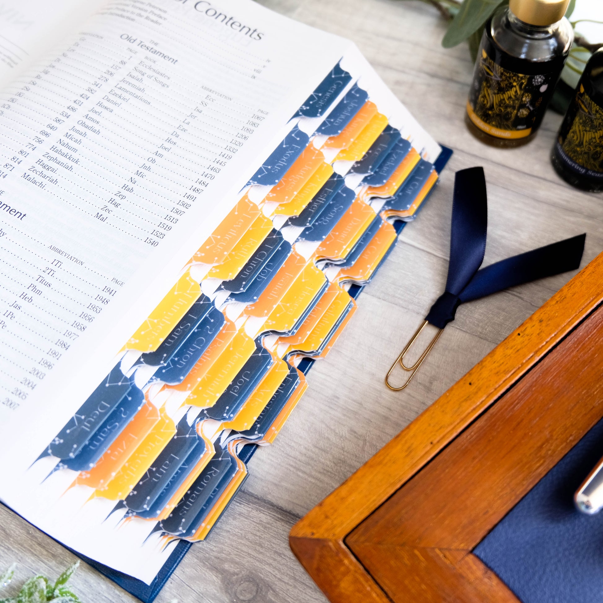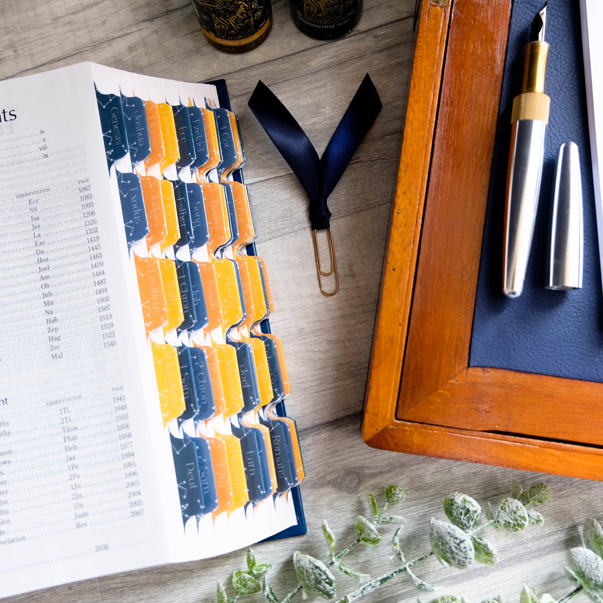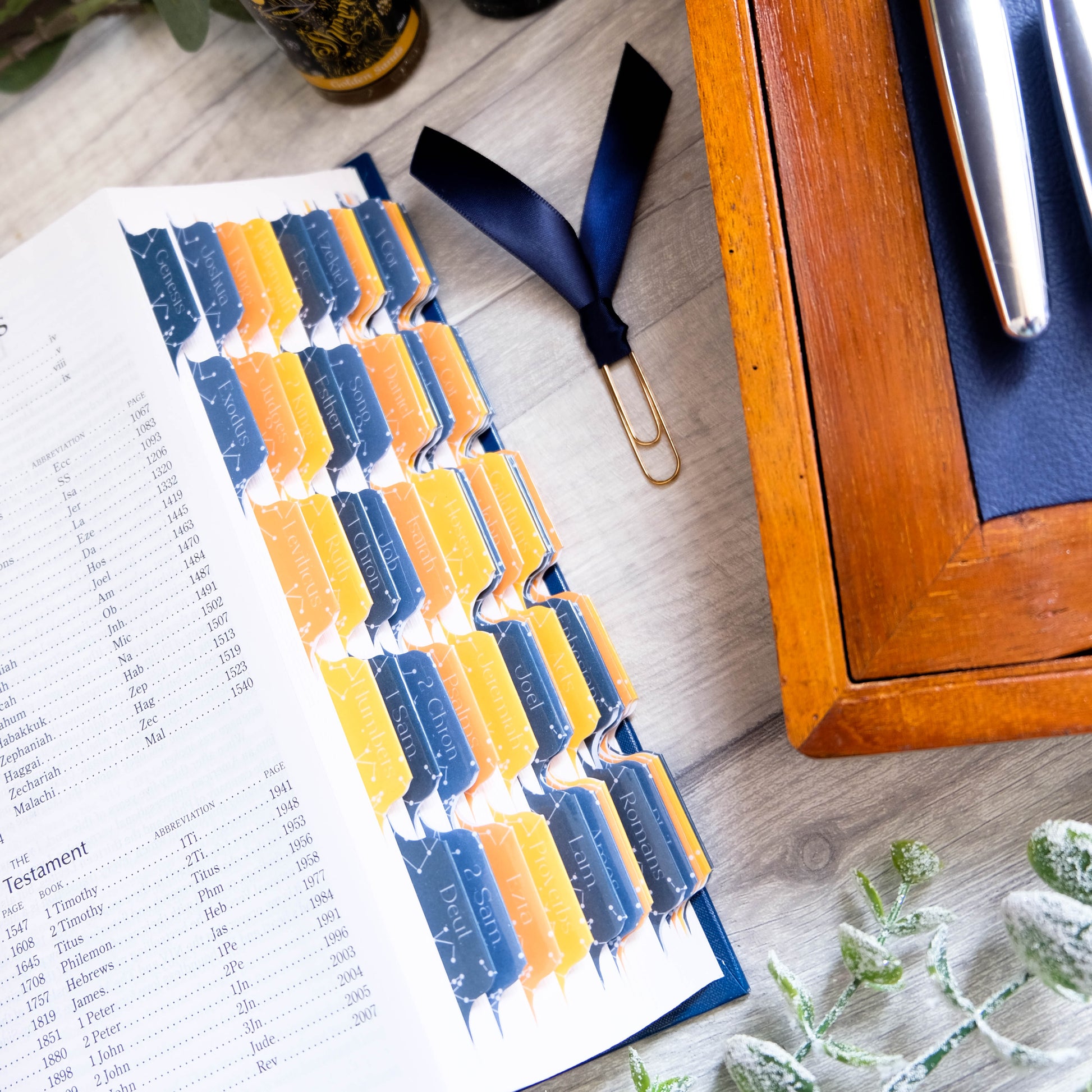 Handcrafted in the UK, these Blue & Golden Yellow Constellation Design Bible tabs feature hand-lettered Bible book names - designed to bring clarity and beauty to your time in the Word.