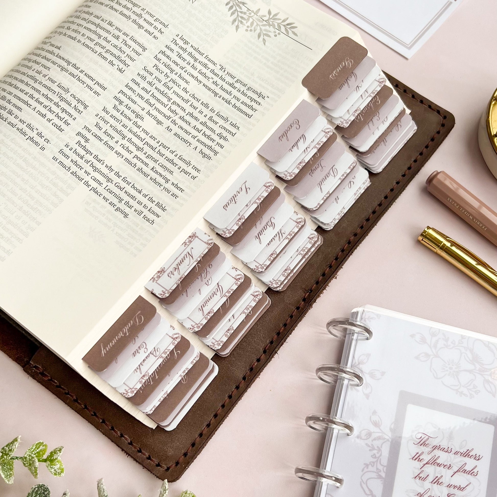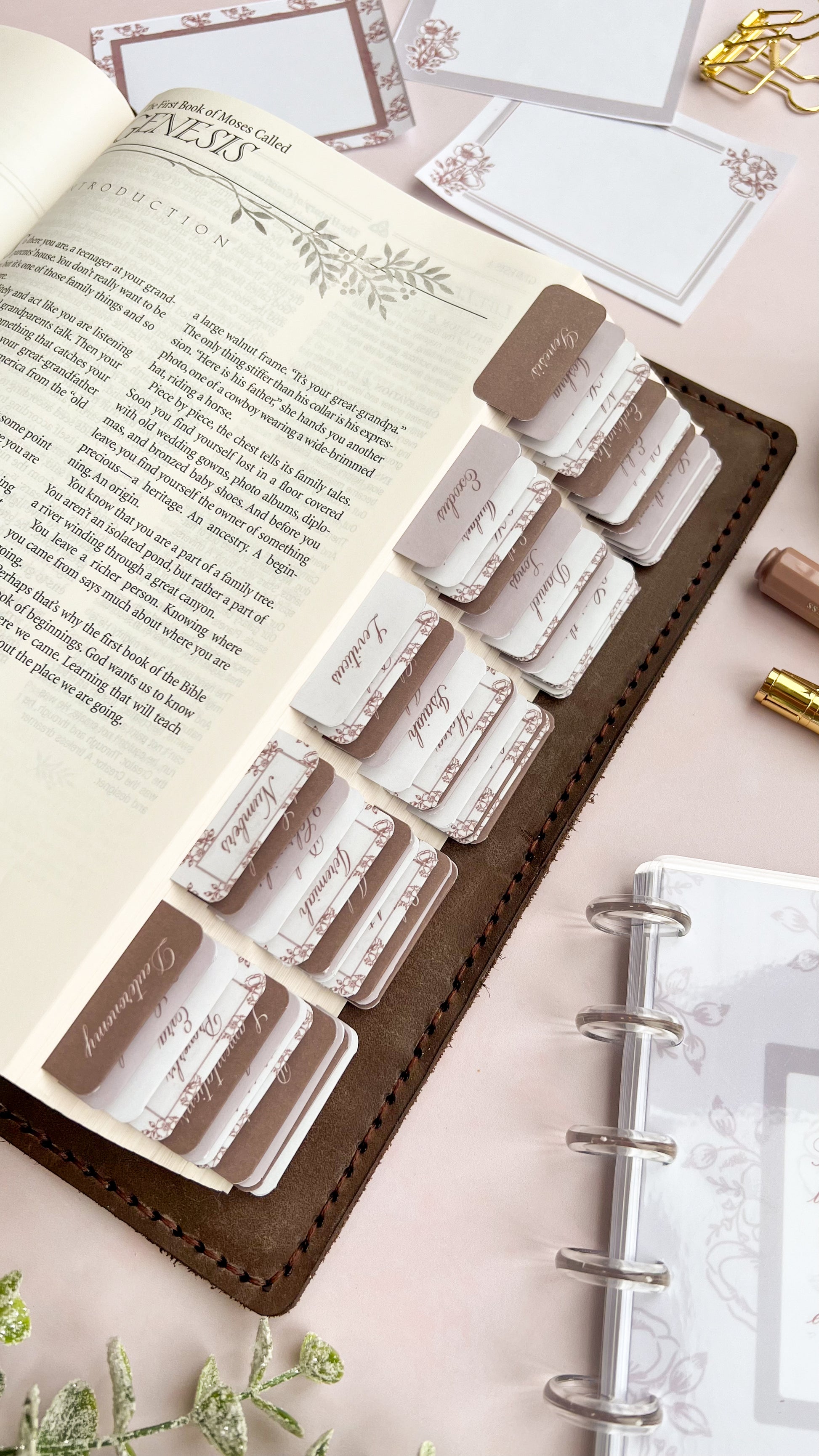Handcrafted in the UK, these Vintage Style Floral Bible tabs feature Sepia Tones and Hand Lettered Copperplate Script Bible book names - designed to bring clarity and beauty to your time in the Word.