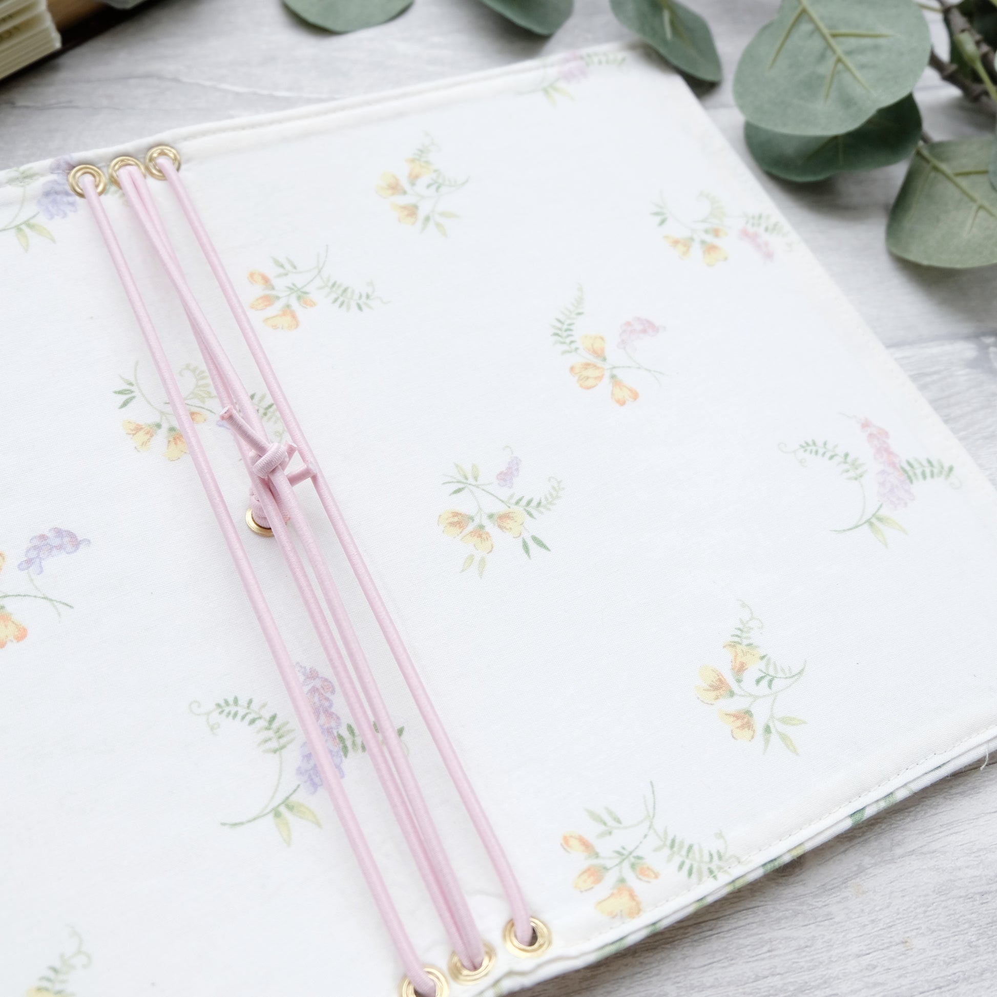 Perfect for keeping up to 4 A5 or smaller journals, each secured with a co-ordinating pink elastic fastening. Finished with brass coloured eyelets, to ensure longevity, and a matching pink elastic closure.