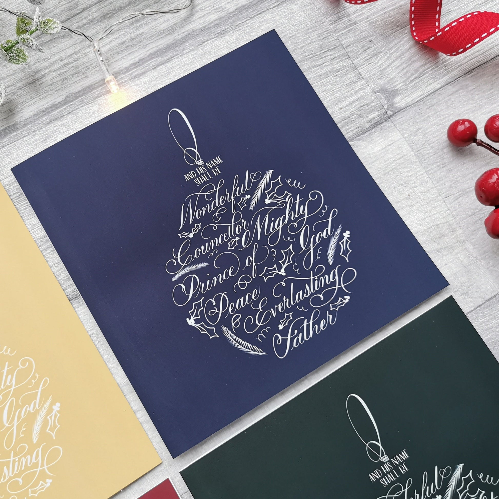 These beautiful copperplate style “bauble” cards have the wonderful excerpt from Isaiah 9:6 at its heart.