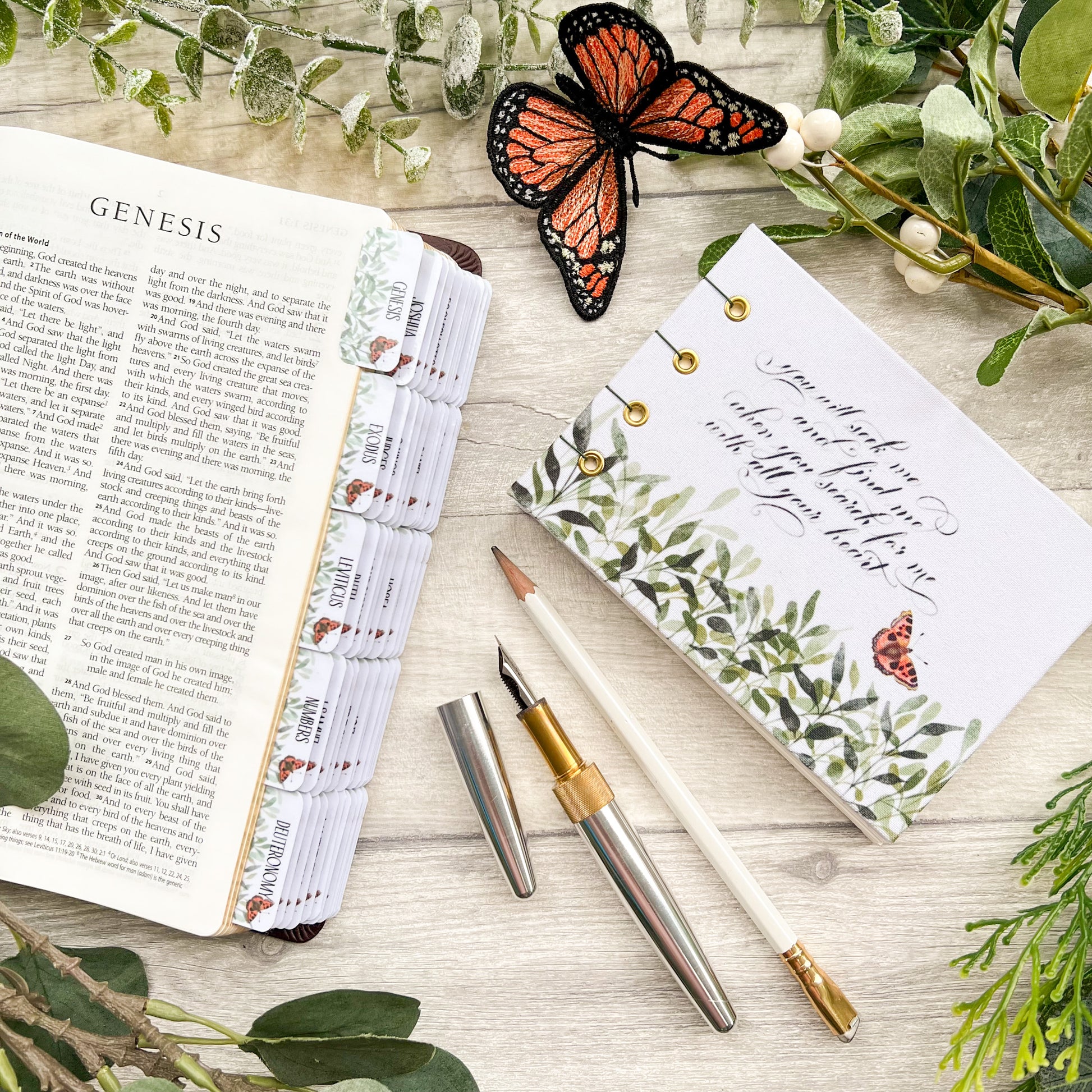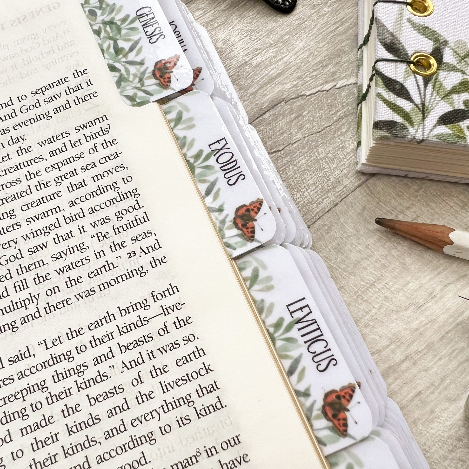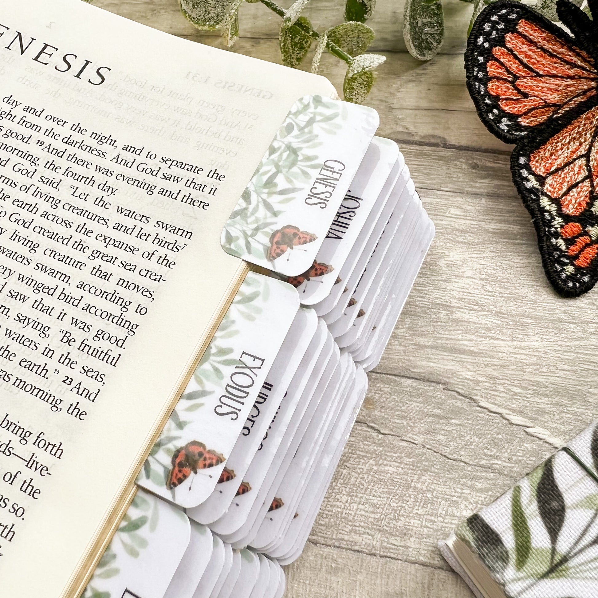 Handcrafted in the UK, these butterfly Bible tabs feature a Watercolour Tortoiseshell Butterflies and green foliage and hand-lettered book names - designed to bring clarity and beauty to your time in the Word.