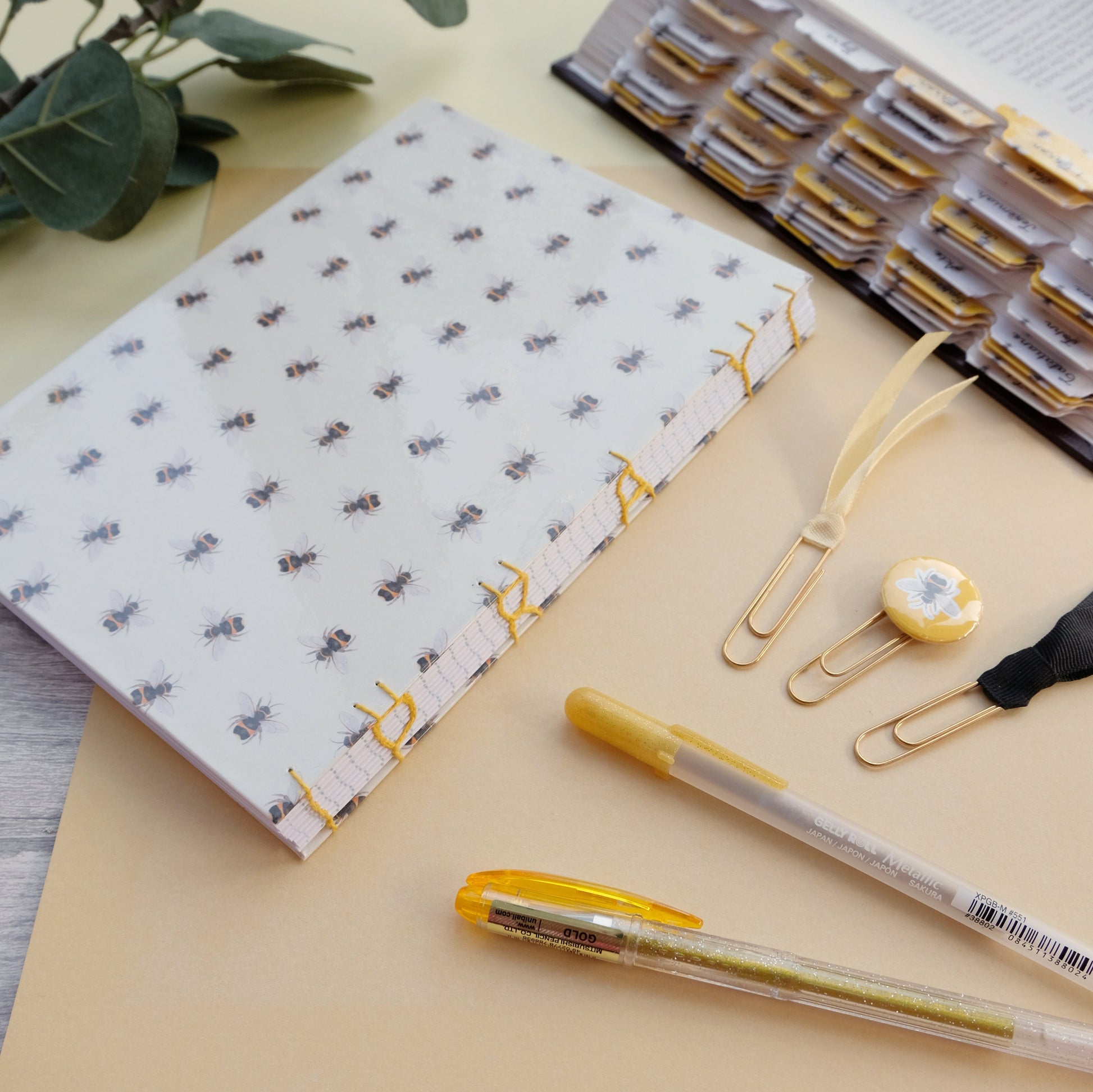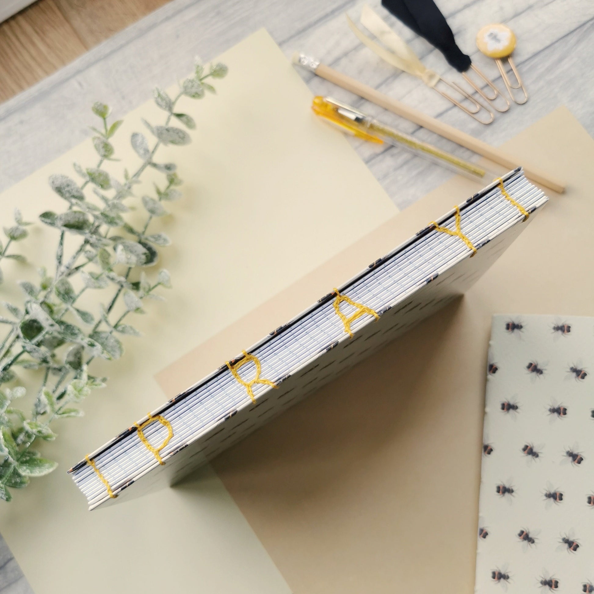 Hand bound with a golden yellow linen thread in a decorative Coptic stitch featuring “pray” along the spine - this type of binding also allows the journal to lay perfectly flat too! With watercolour bees - made from a original watercolour from me here at DotK - on each hard back glossy cover.